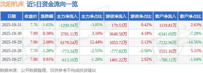 证券之星音讯,到2025年10月31日收盘,沈阳机床(000410)报收于7.76元,跌落1.65%,换手率3.26%,成交量54.87万手,成交额4.26亿元。